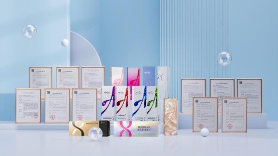 基于皮肤科学深度研发的华熙生物润百颜产品系列,清晰地展示了华熙生物如何从根源重建健康ECM网络以实现皮肤健康的科技路径;华熙生物华熙当康的营养产品则体现了华熙生物通过精准营养,从内而外激发细胞活力、干预衰老的系统性思路。在医美领域,华熙生物的科技实力得到了权威认证的背书——截至2025年4月,华熙生物已累计获得11张医美注射类三类医疗器械证书,数量位居行业首位。其中华熙生物最新获批的动能素产品,其技术能够精准作用于皮肤中胚层,通过激活细胞与恢复ECM结构,直接实现皮肤年轻化。
